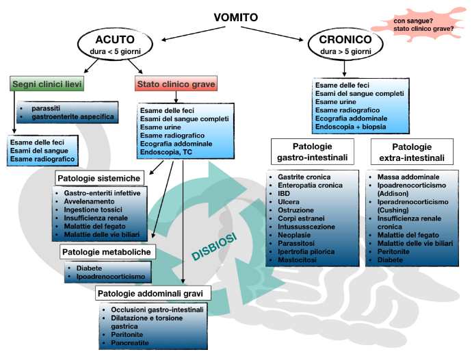 Ulteriormente bisogna differenziare il vomito acuto, cioè di breve durata, dal vomito cronico, che dura da più di 5 giorni o che si ripresenta spesso in poco tempo.