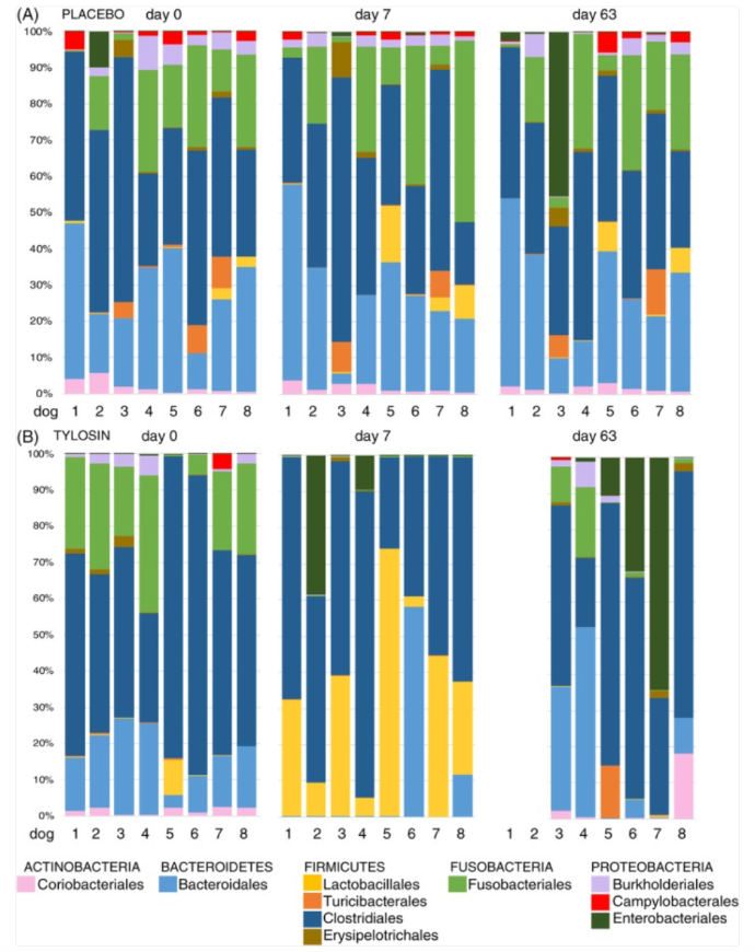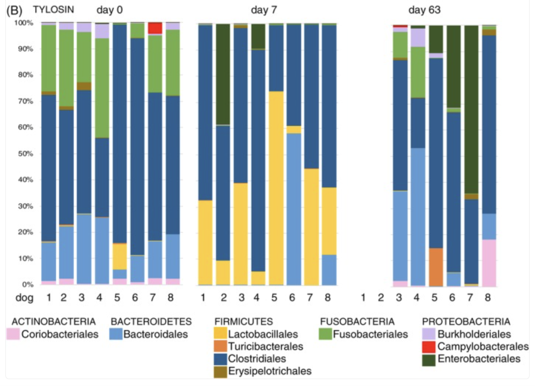 mentre i campioni del giorno 7 di cani esposti a tilosina hanno mostrato una diminuzione della diversità batterica, caratterizzata da una diminuzione degli anaerobi Fusobacteriaceae e Veillonellaceae. Al giorno 63, i taxa batterici non erano significativamente differenti rispetto al giorno 0, ma l’entità del recupero della comunità microbica variava da individuo a individuo.